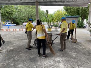 1. ร่วมกันปรับปรุงภูมิทัศน์ กวาดใบไม้ ตัดหญ้า และทำความสะอาดศาสนสถาน
