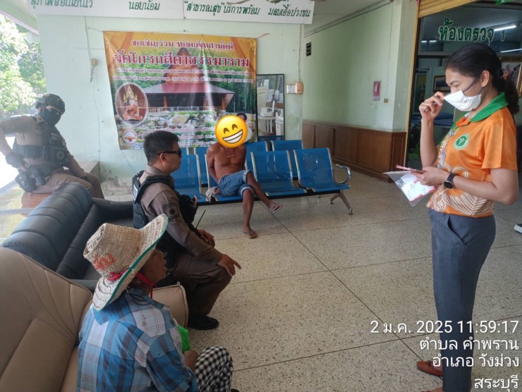 ๒ มกราคม ๒๕๖๘ เวลา ๑๑.๑๕ น. ภายใต้การอำนวยการ สั่งการของ พ.ต.อ.จตุรงค์ สมศรี ผกก.สภ.วังม่วง มอบหมายให้ ร.ต.ท.ไชยวัฒน์ ขุนโยธา รอง สวป.ฯ ร้อยเวร ๒๐ พร้อมด้วยสายตรวจรถยนต์ สายตรวจรถจักยานยนต์ ร่วมกันนำตัวบุคคลมีอาการคลุ้มคลั่ง มาพบแพทย์ ที่ รพ.วังม่วงสัทธรรม